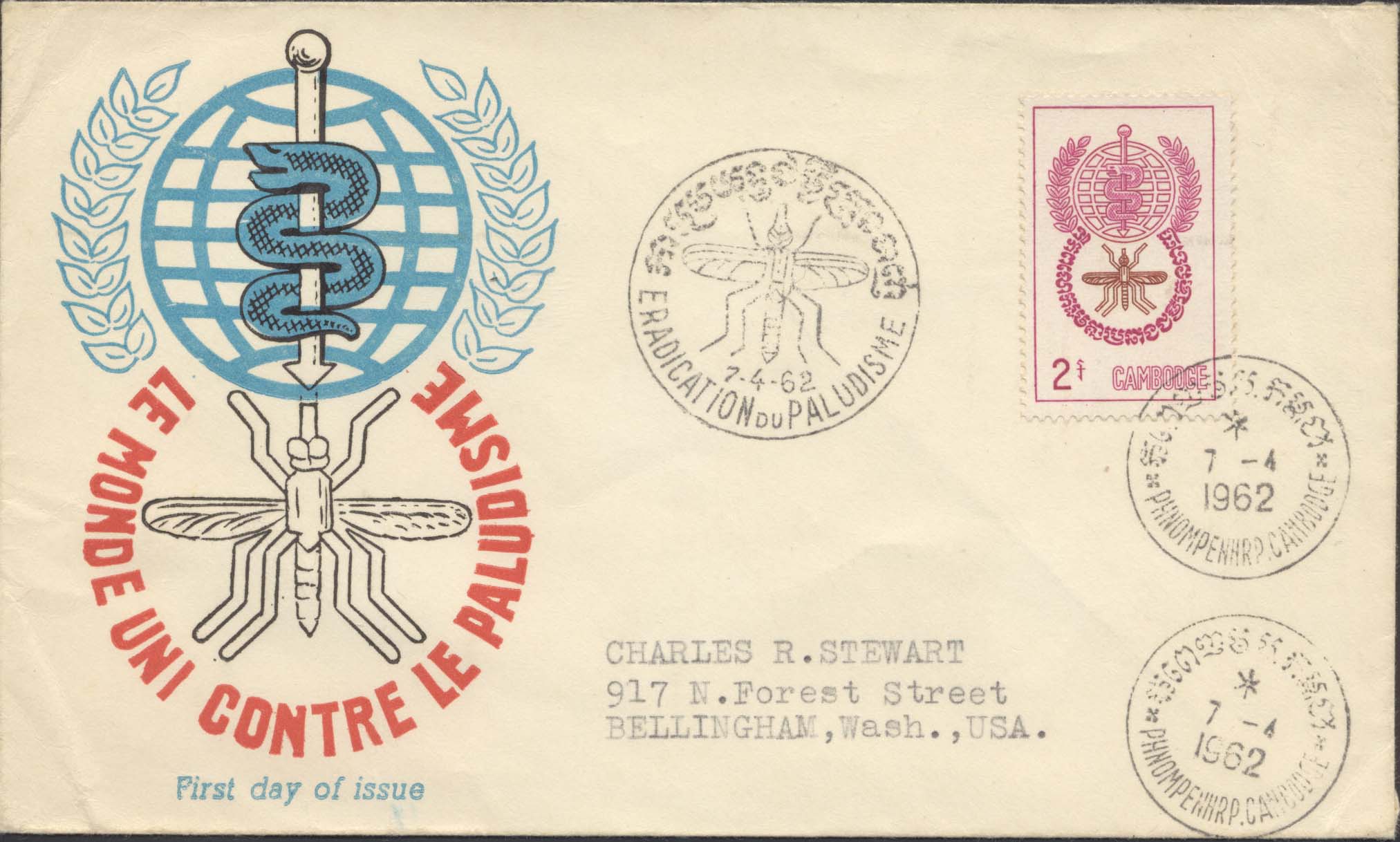 Scott 106 (FDC w Malaria Symbol Red/Blue (addressed (Washington)))
