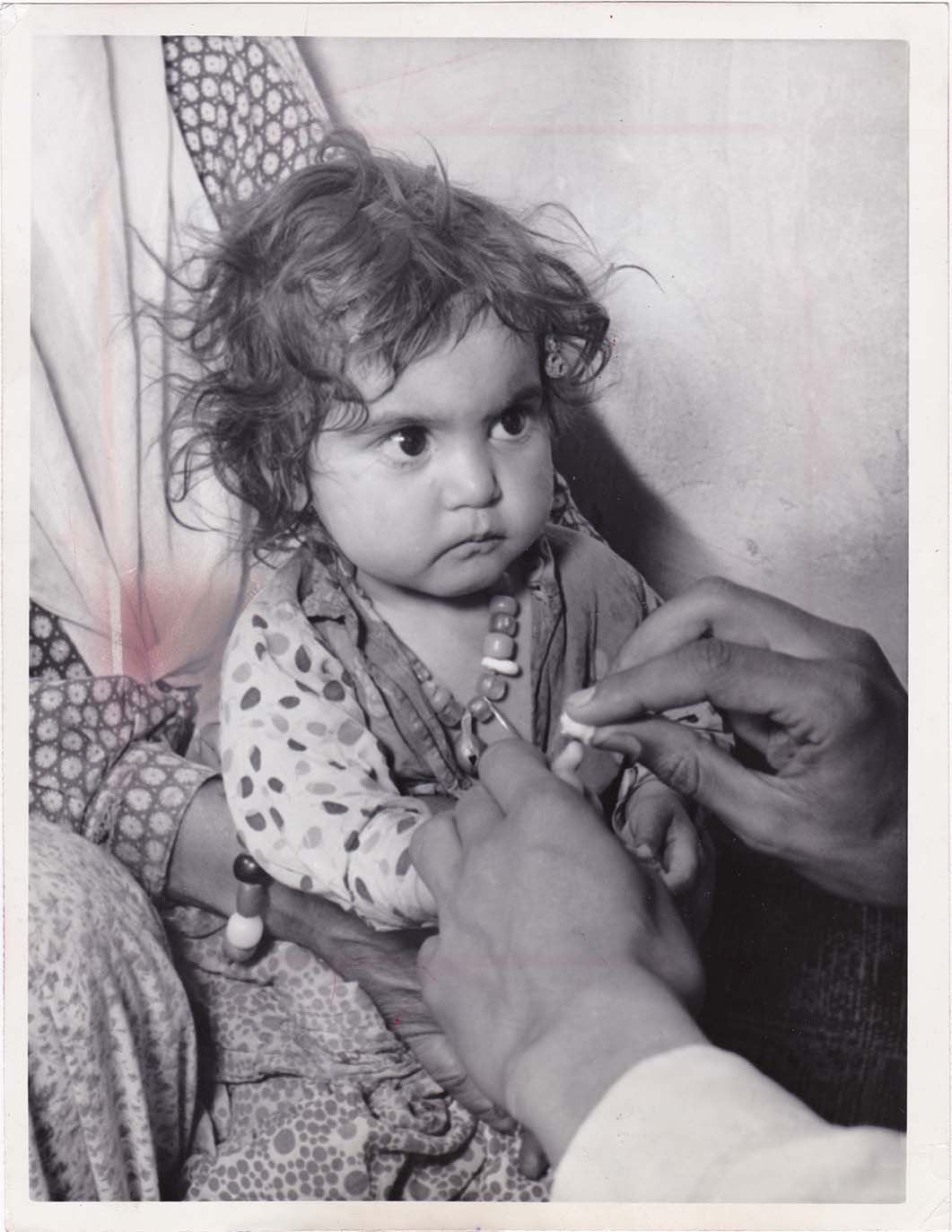 The back of the picture has the following text: "In Iran, the souful eyes of a child seek trust in the hands of a doctor as he prepared to take a blood smear from her finger. The campaign was aimed at eliminating malaria. -UPI Photo"